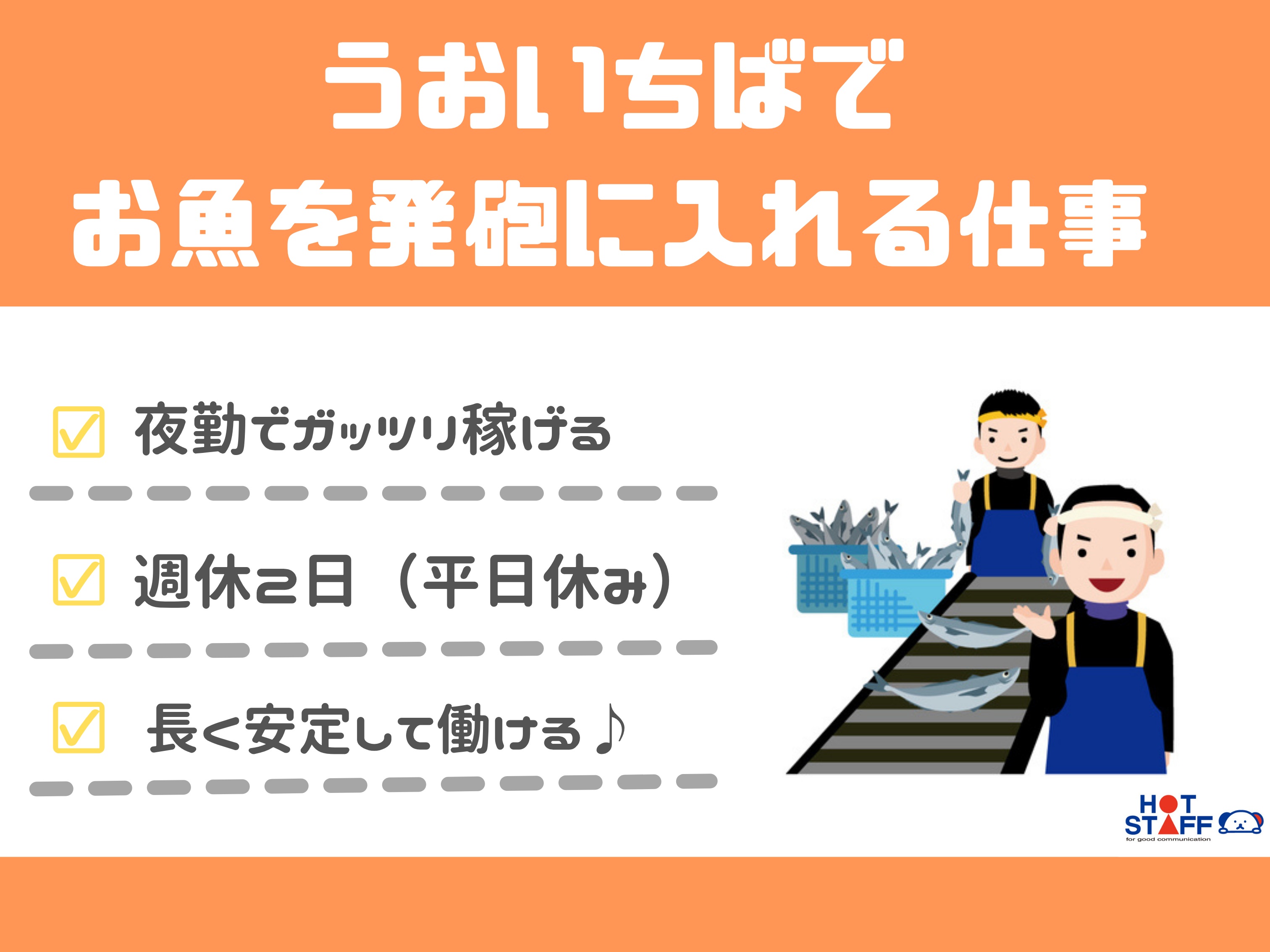 23:00スタート夜勤/1日6時間/週休2日/魚市場でさかなをすくって発砲スチロールに入れていく仕事/新たなチャレンジ応援