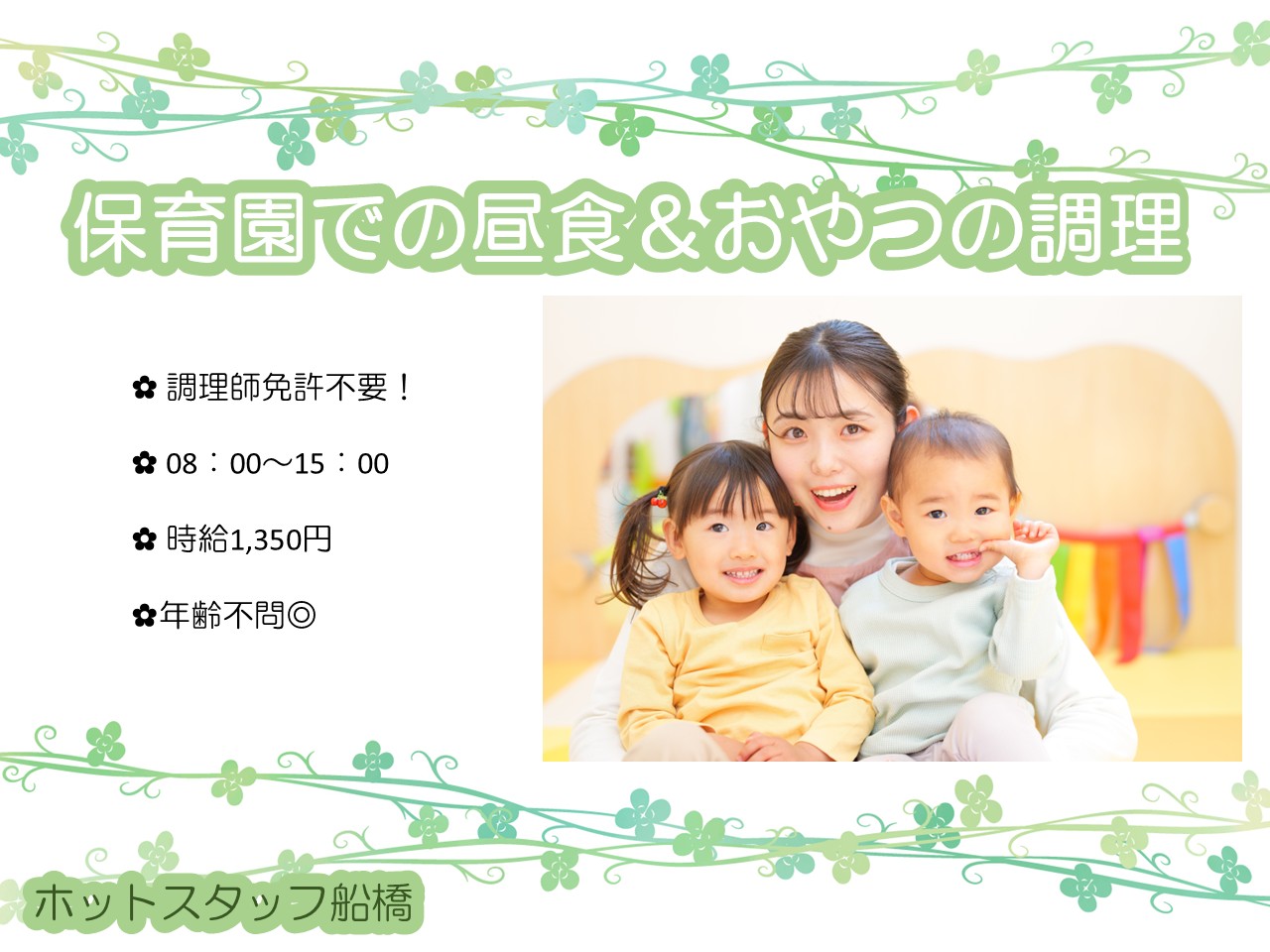 〈市川市〉調理師免許不要!≪未経験OK/時短勤務相談可≫ 保育園での調理&おやつの準備staff☆