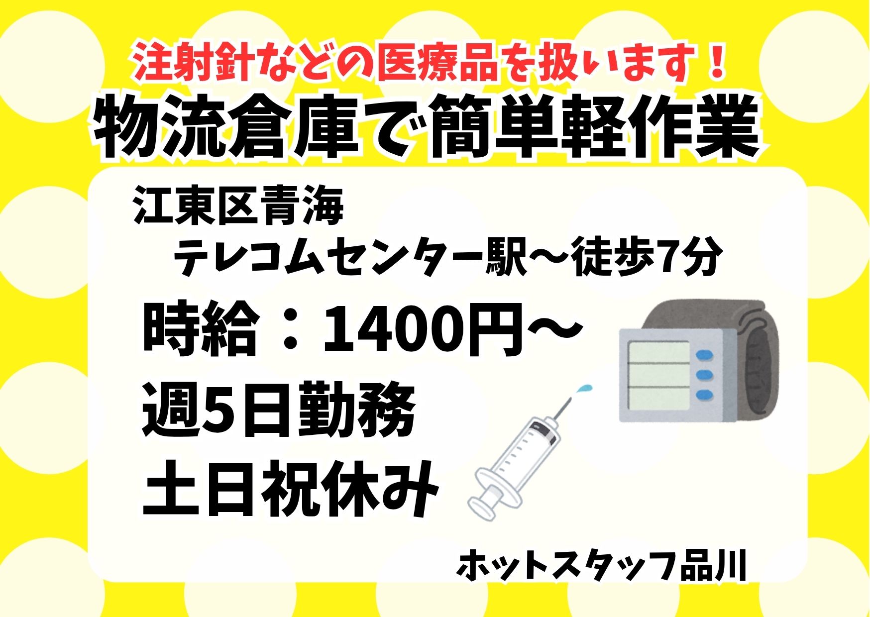 【冷暖房完備で快適】週5日勤務!土日祝休み!医療機器を扱う倉庫で簡単軽作業!<未経験OK>
