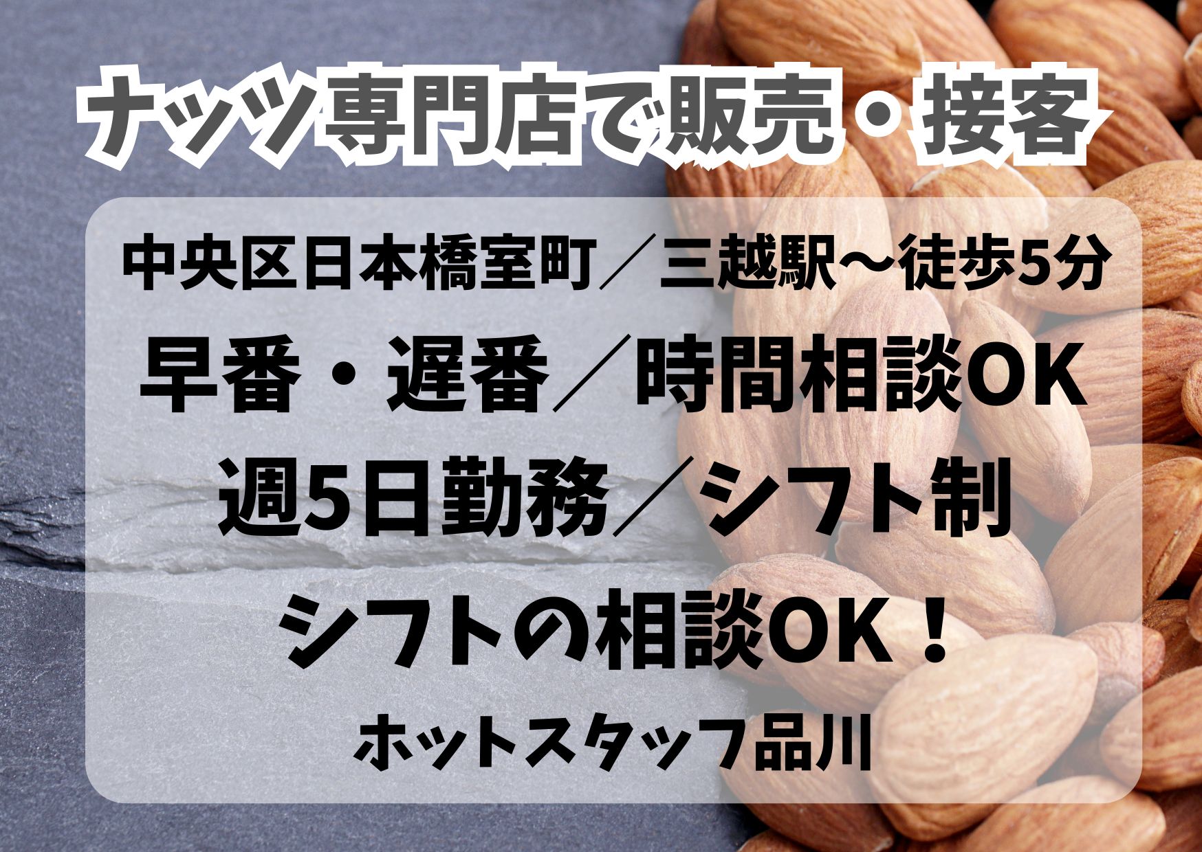 【希望シフト制&シフトの相談OK】時間の相談OK!週5日!ナッツ専門店での販売業務<即日勤務OK>