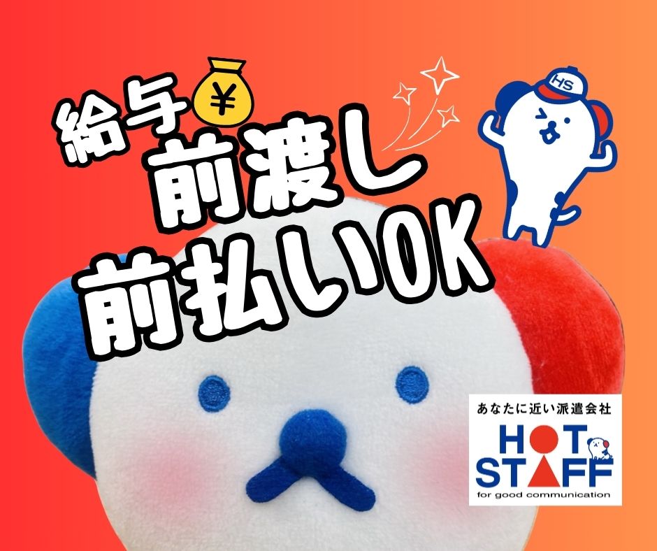 月収例 ¥1500×7.5H×20日=月収22万円以上可(他、残業代+交通費別途支給、前渡し(前払い)有)