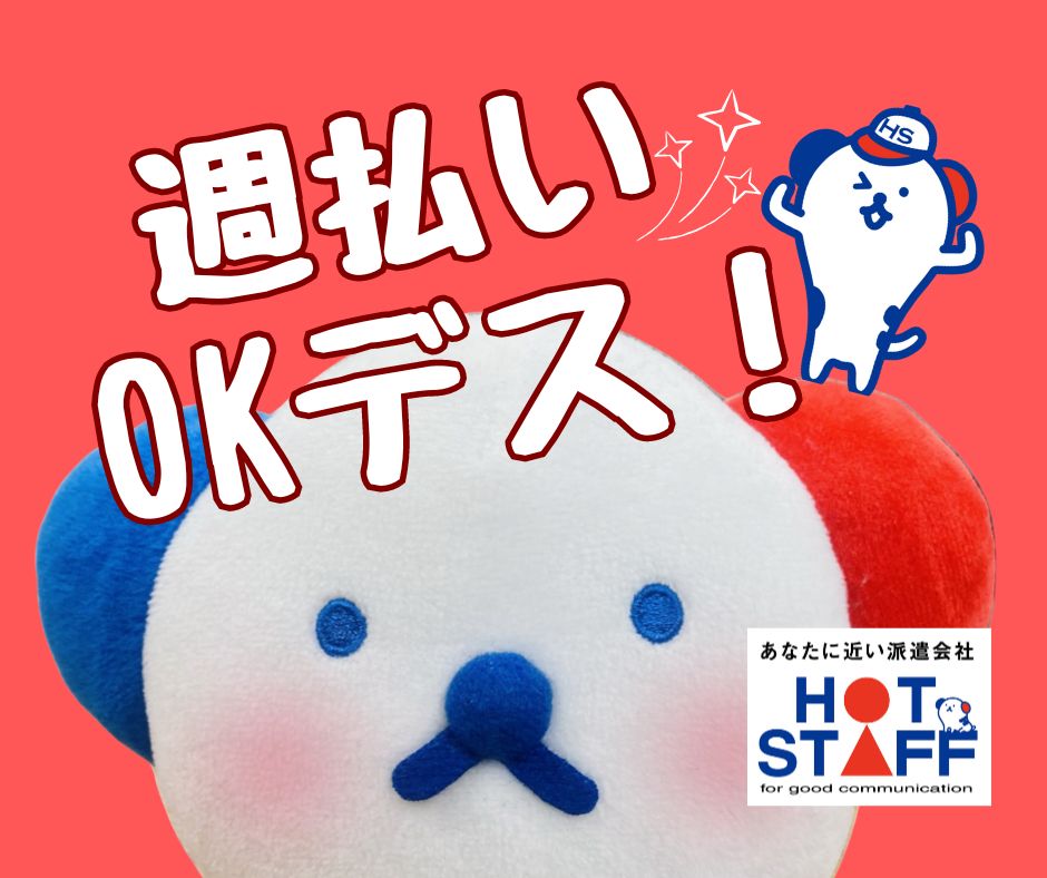 月収例 ¥1250×7.5H×21日=月収19万円以上可(他、残業代+交通費別途支給、前渡し(前払い)有)
