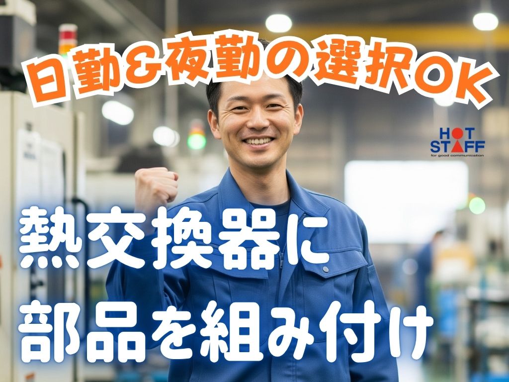 《空調完備の工場・熱交換器に部品を組み付け》日勤&夜勤選べる/完全土日休み/繁忙期だけ残業多め