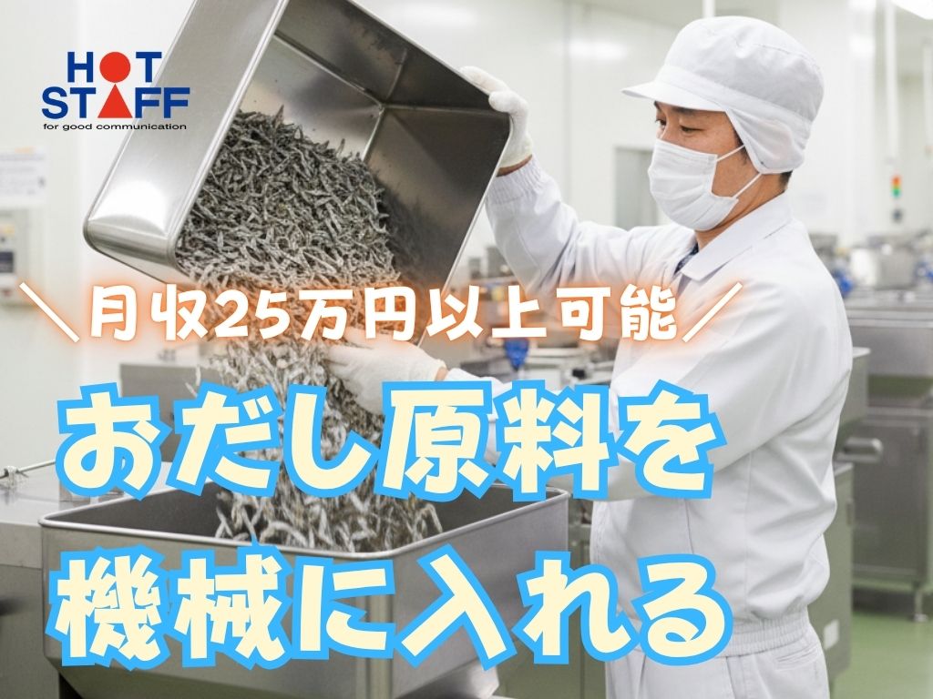 《年末までの短期バイト・おだし原料を機械に入れる》月収25万円以上可能/残業少なめ/完全土日休み