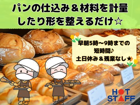 早朝5時~9時までの短時間/土日休み/残業なし/パンの仕込み&材料を計量したり形を整えるだけ