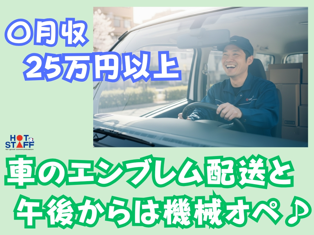 《午前は車のエンブレムの配送と午後は機械オペ♪》未経験OK/月収25万円以上/フォークリフト免許