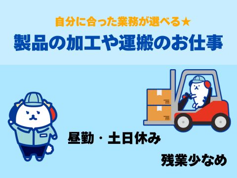4つの業務から自分に合った仕事が選べる★<日勤・土日休み>製品の加工や運搬作業♪