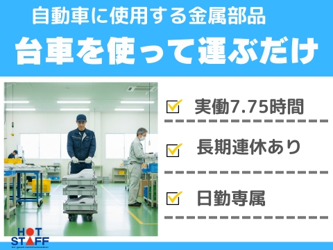 完全土日休み×残業なし◎/未経験OK/プライベートとの両立ができる!/金属部品を台車で運ぶだけ