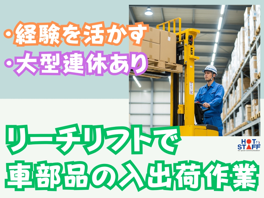 《リーチリフトで車部品が入った段ボールを運搬》経験を活かす/大型連休あり/車通勤OK