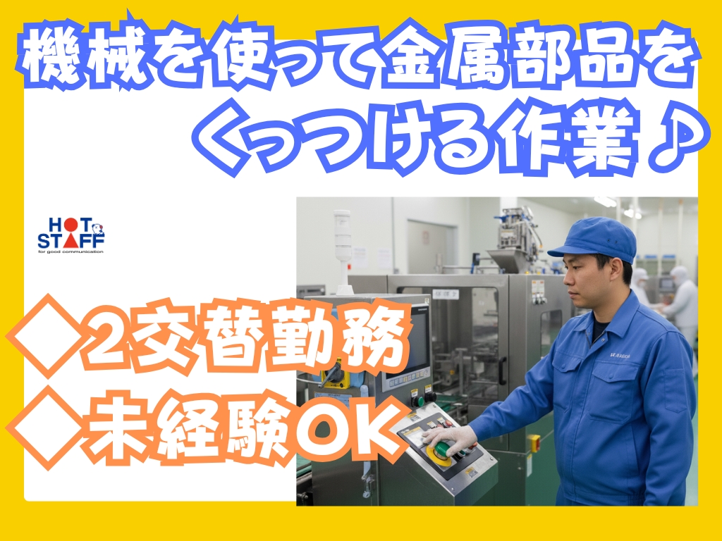 《機械にセットして2つの金属部品をくっつける作業》2交替勤務/未経験OK/月収26万円以上