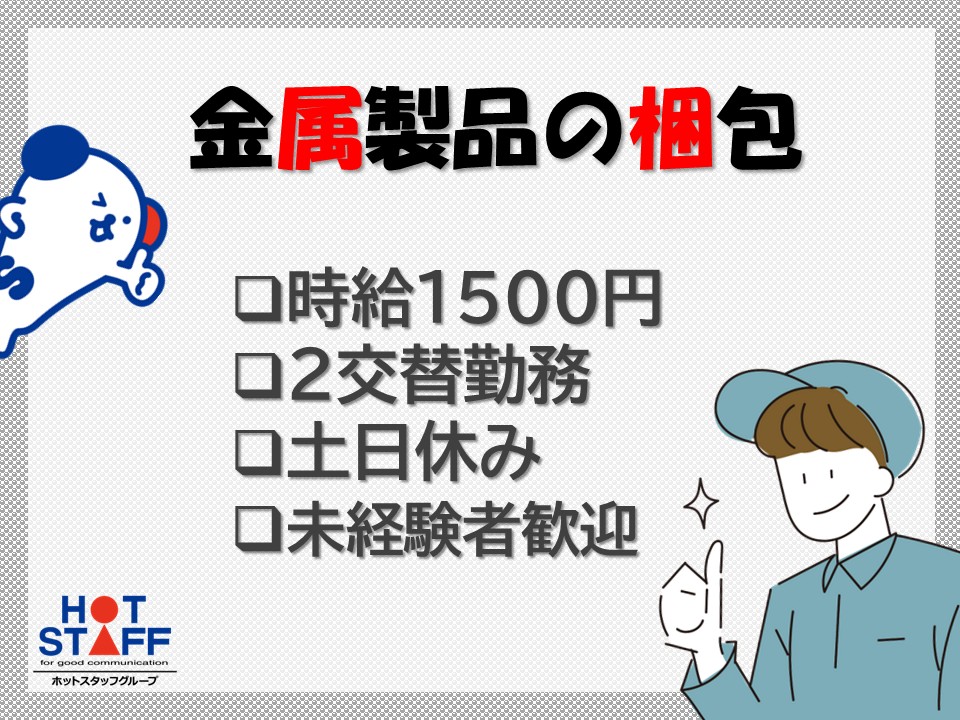 【金属製品の梱包】時給1500円/高収入/土日休み/長期安定☆