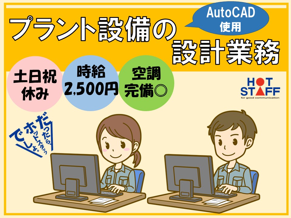 【AutoCADでプラント設備の設計業務】高時給2,500円/日勤/土日祝休み/経験を活かせる/正社員登用のチャンスあり♪