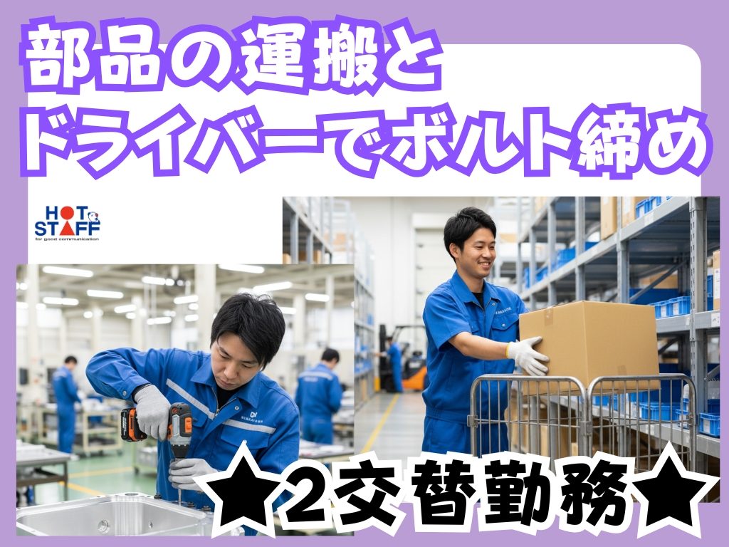 《商品を棚へ収納とアルミ製品のボルト締め》未経験OK/2交替勤務/土日休み/モクモク作業