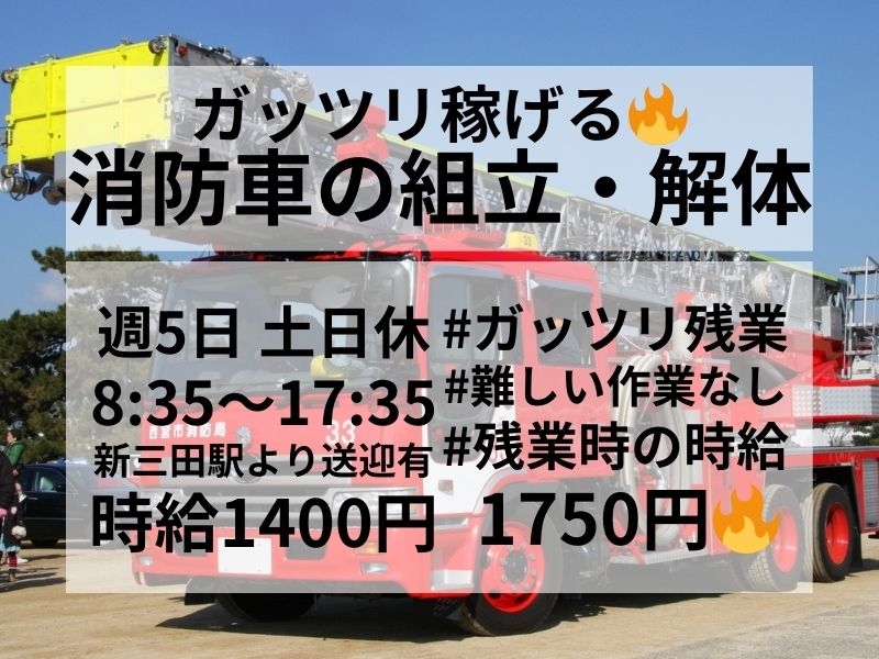 <残業ありでガッツリ稼げる♪>時給1400円*消防車の組立や解体のお仕事♪土日休