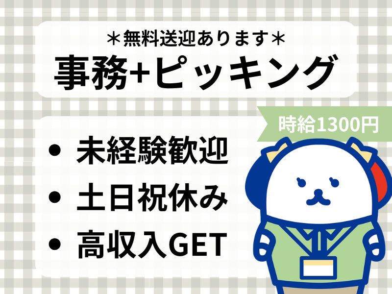 <3箇所から無料送迎あり♪>高時給1300円!人気の事務*かんたんデータ入力*ピッキング作業あり♪土日祝休み◎
