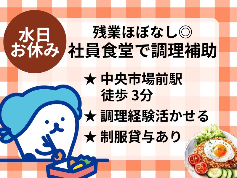 <中央市場前駅 徒歩3分>調理経験が活きる*社員食堂内で揚げ物作りや盛り付けなど◎珍しい水日お休み♪
