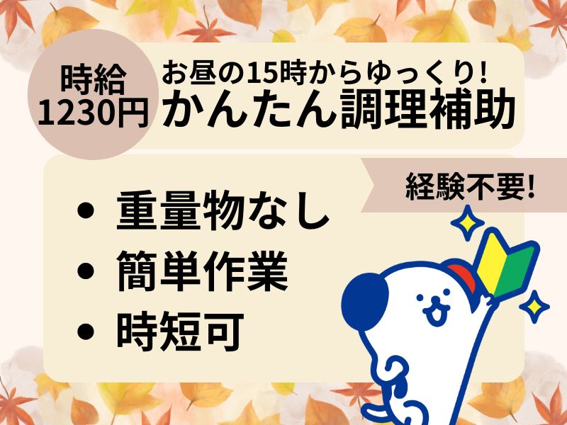 <出勤日数・時短相談可能!>お昼の15時からゆっくり*野菜の下ごしらえなど調理補助♪未経験OK!