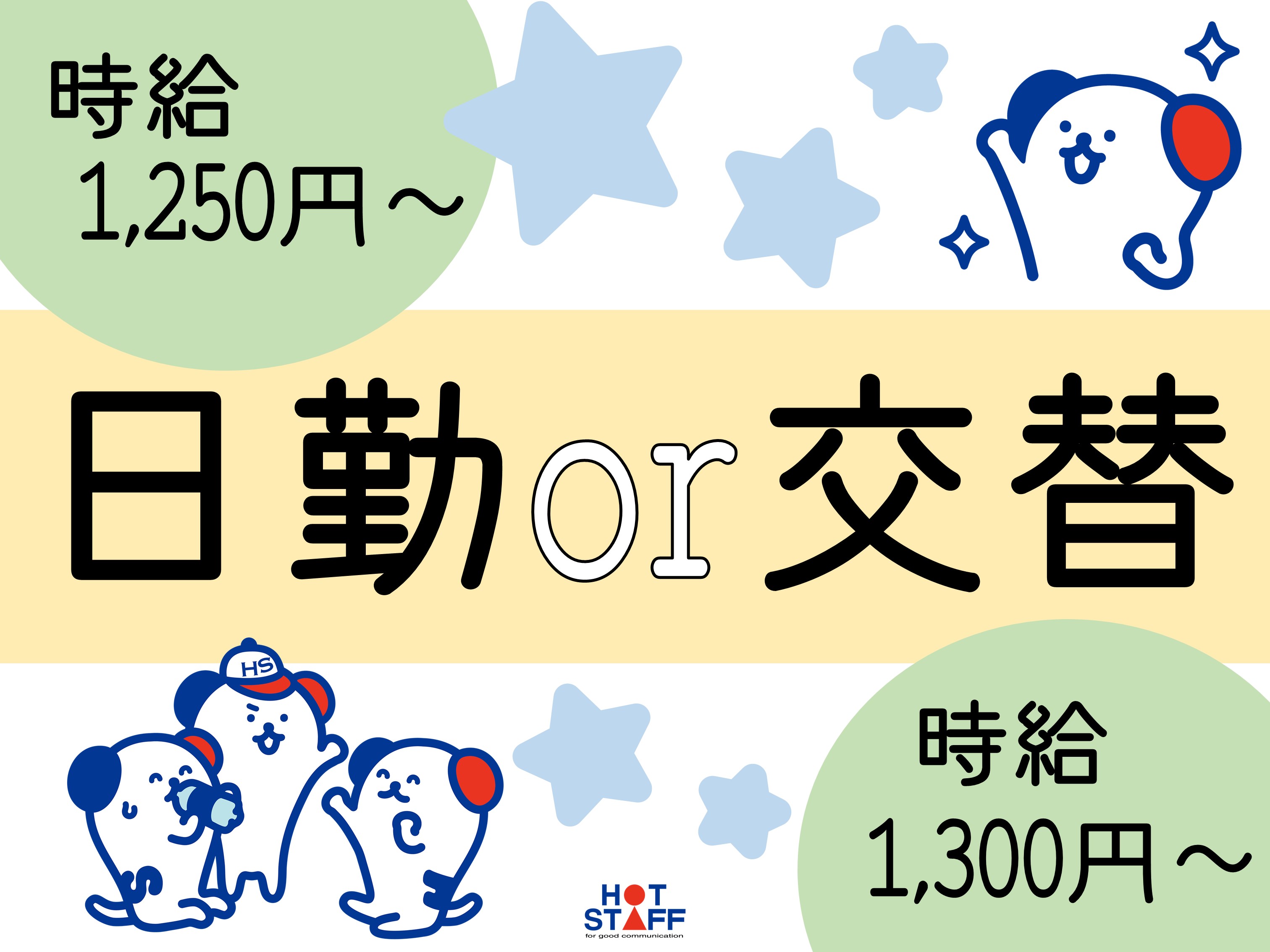 月収例 [日勤]時給1,250円×7時間40分×約21日=20.1万円以上可能!+交通費(規定)