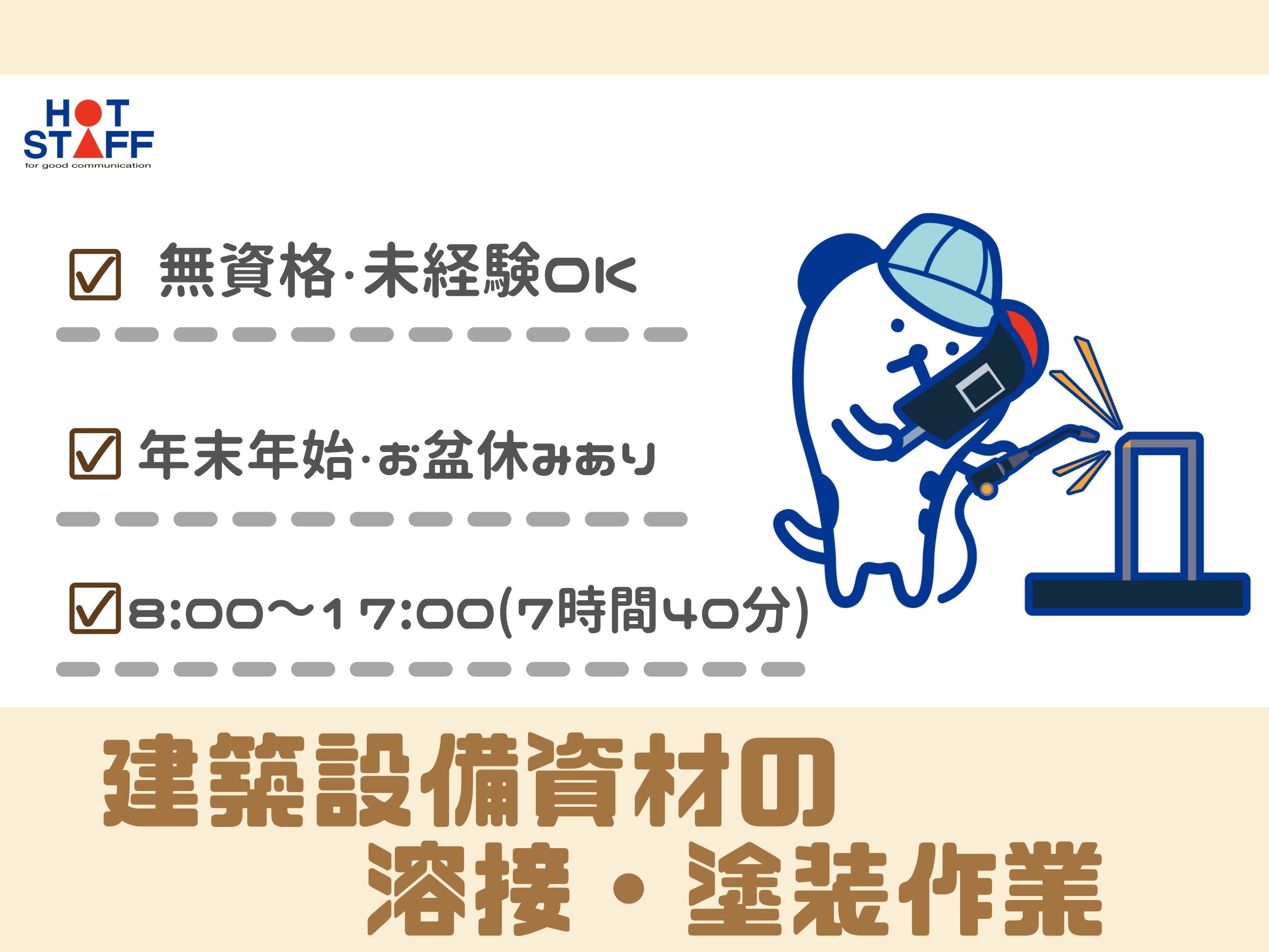未経験から溶接工にチャレンジ♪/土日祝休み・日勤のみ/建築設備資材の加工会社で溶接工