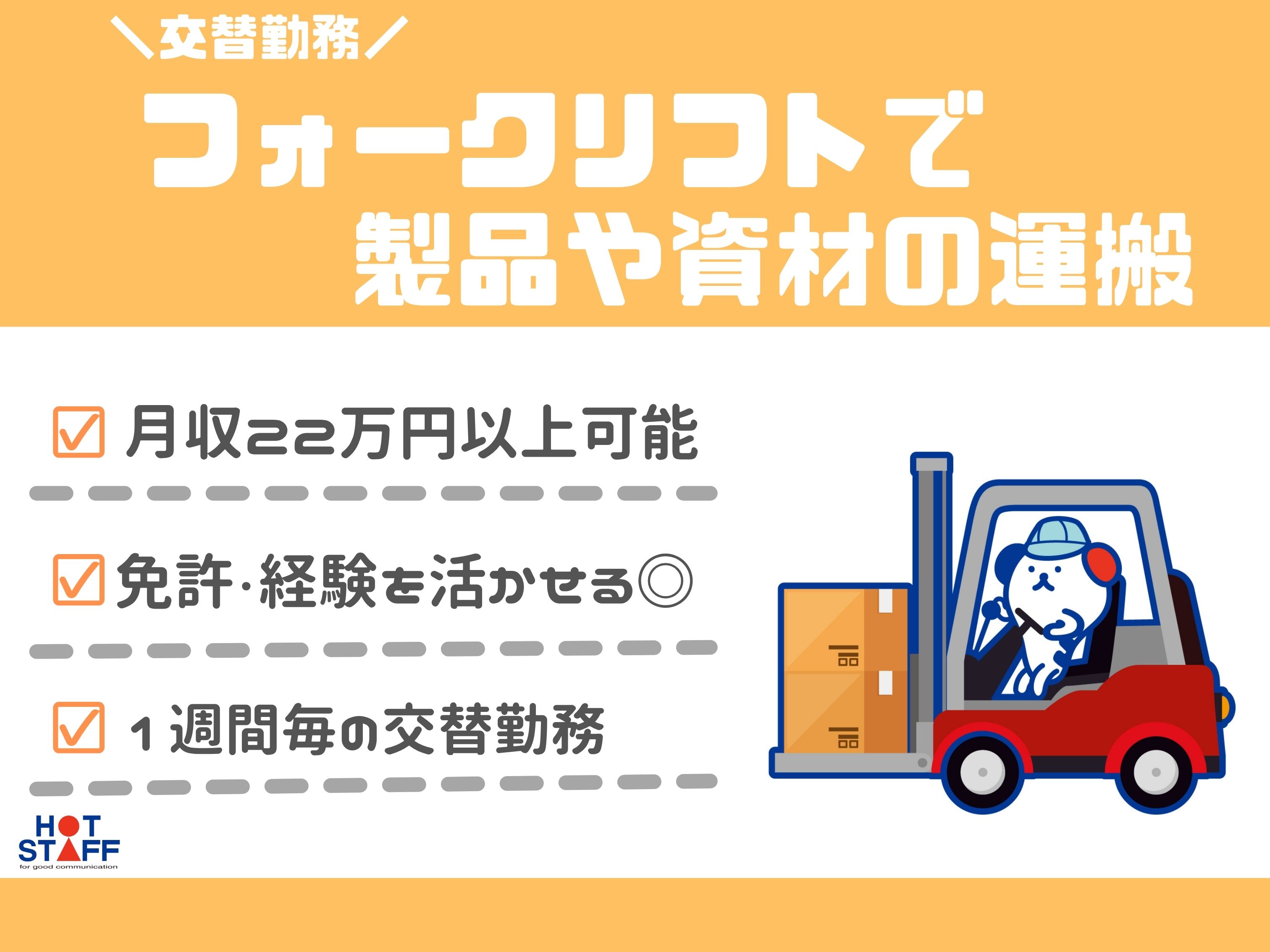 交替勤務でがっつり稼ぎたい方♪/リフト免許必須/(土)日休み・長期休暇あり/自動車部品などの工場内運搬