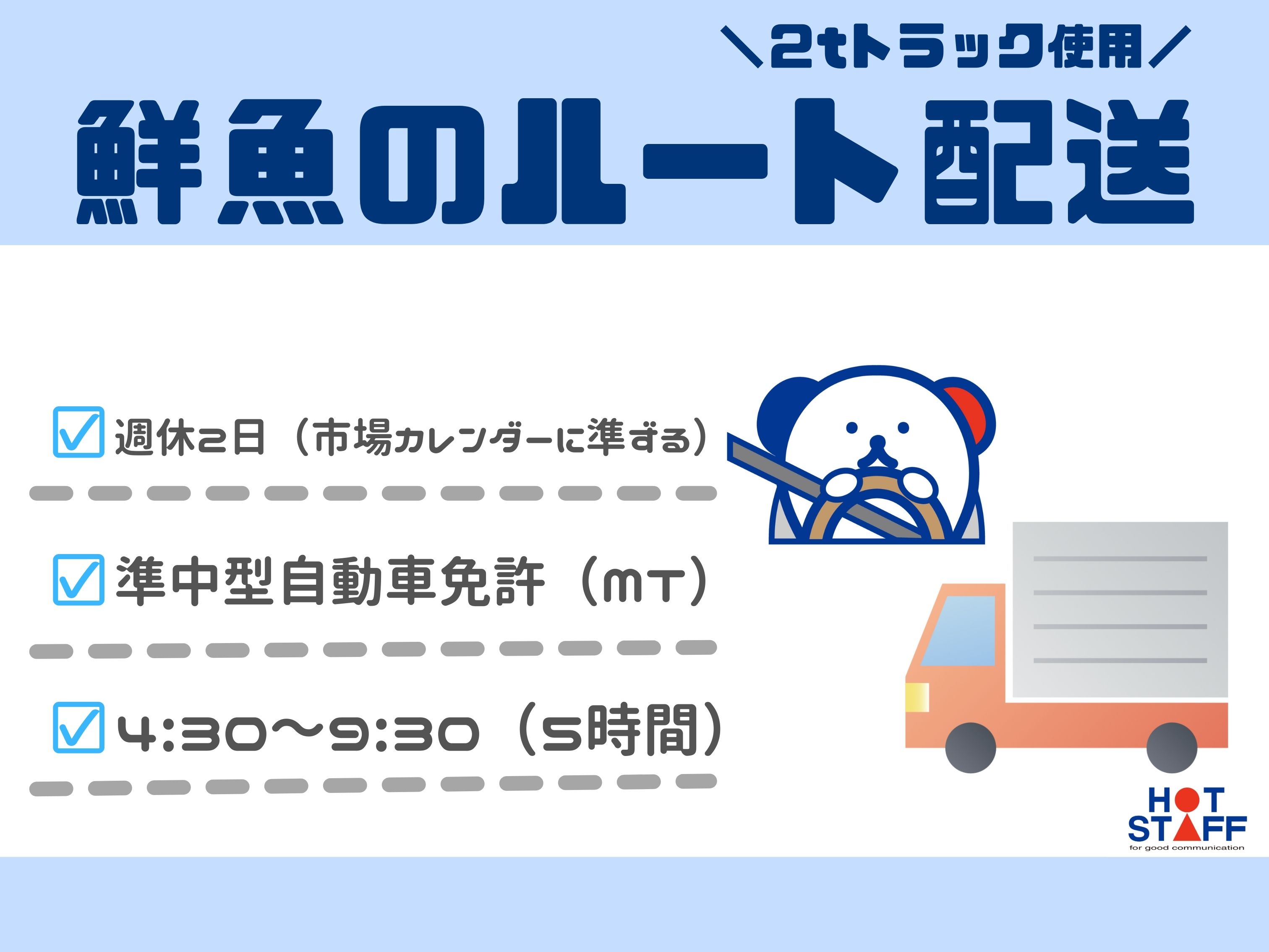 早朝から短時間だけ働きたい方♪/4:30~9:30・水日休み/2t車でスーパーへお魚などの配達