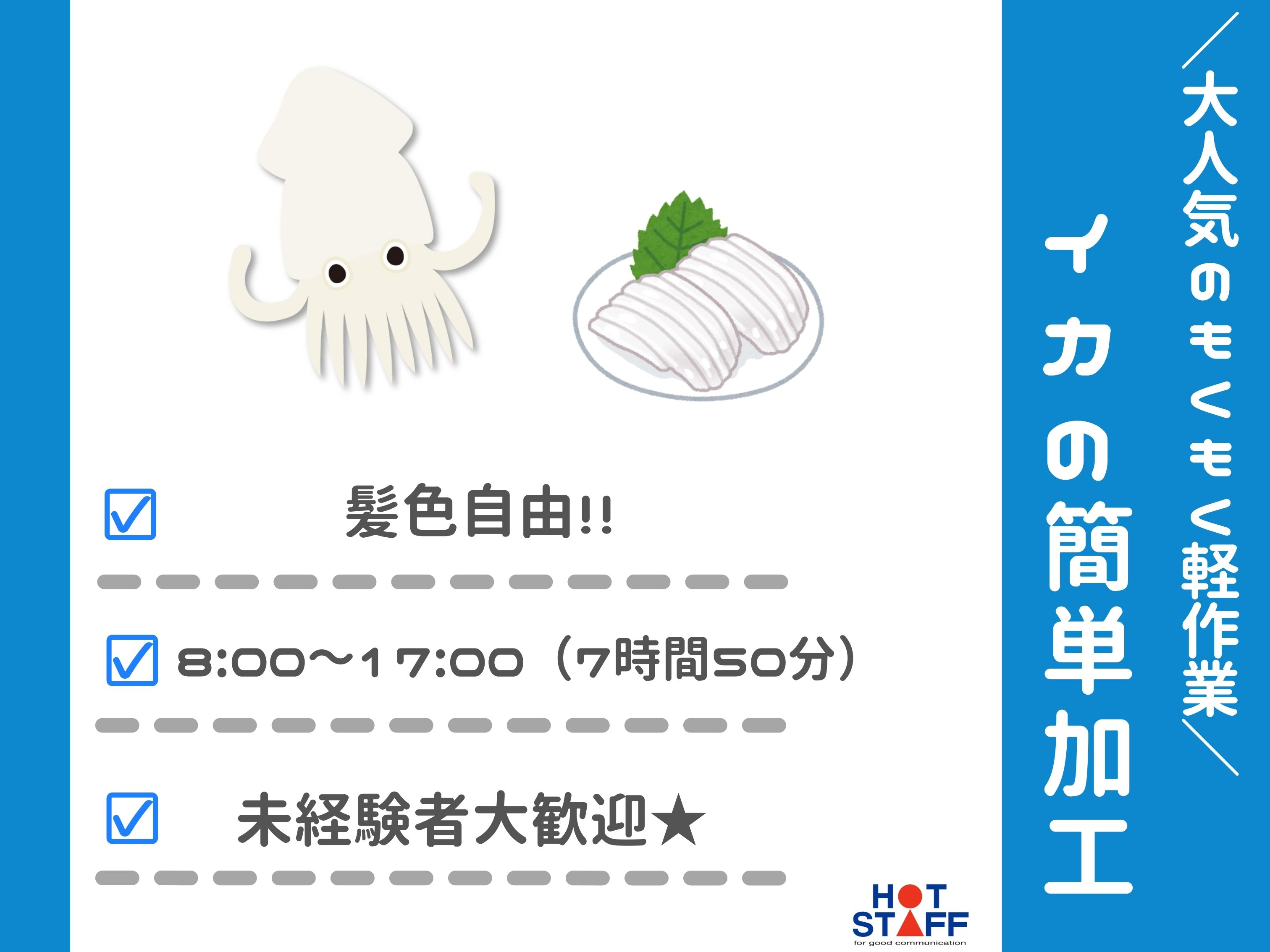 もくもく簡単作業をお探しの方☆/水日祝休み・~17時まで/イカを機械にセットする加工作業くコ:彡