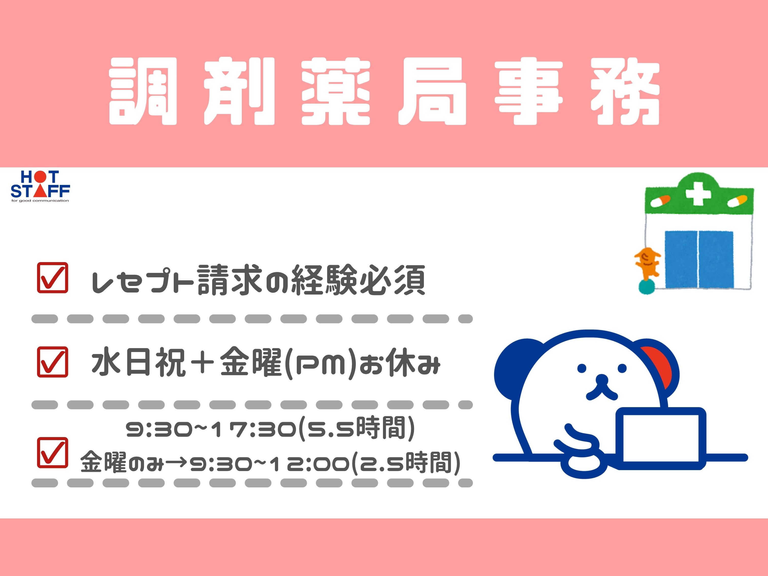 レセプト請求の経験を活かせる♪/水日祝+金曜午後休み・長期休暇あり/調剤薬局事務