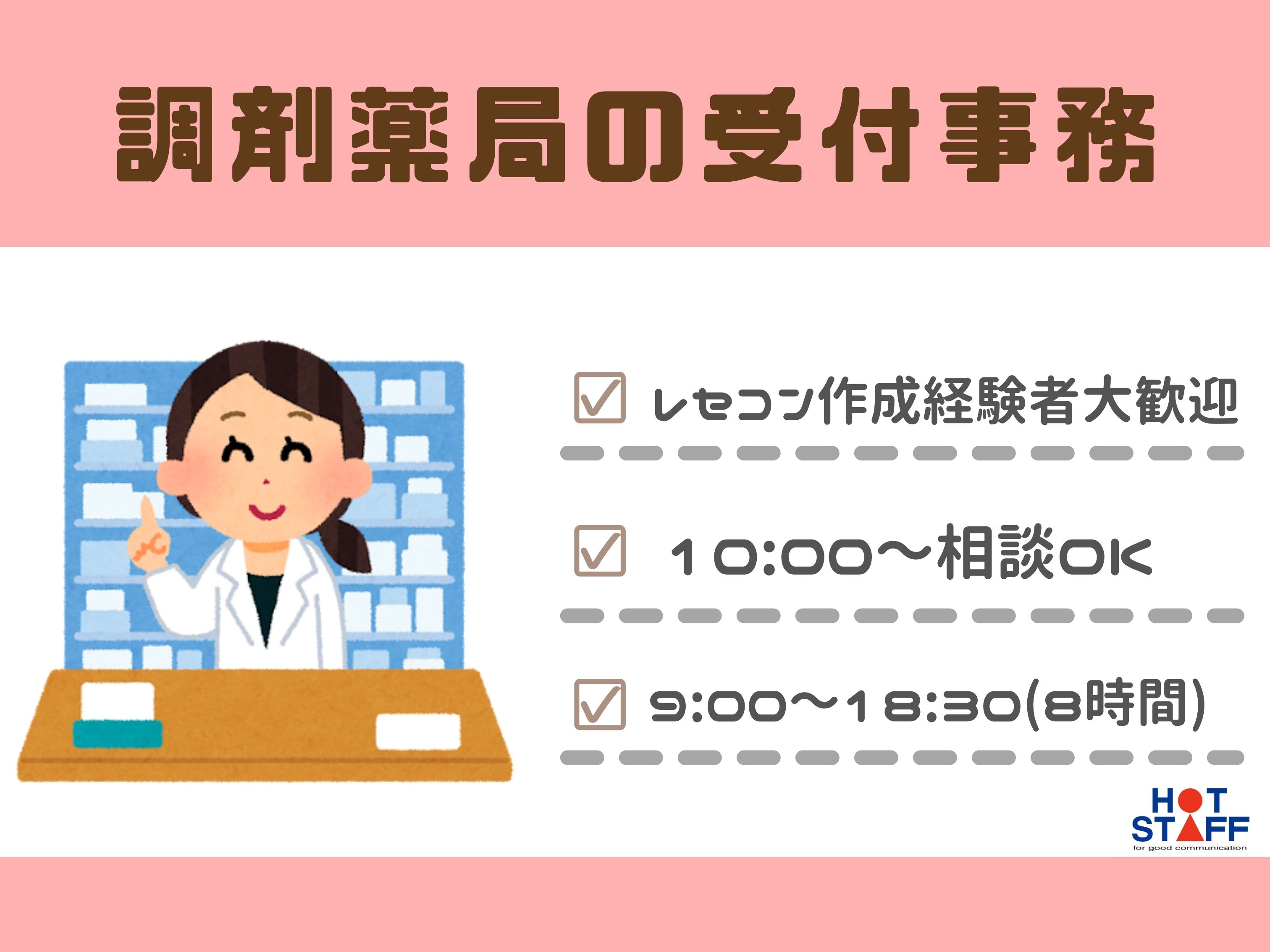 経験を活かしての転職に◎/調剤事務・医療事務経験者/土日祝休み・10時~相談OK/調剤薬局の受付事務