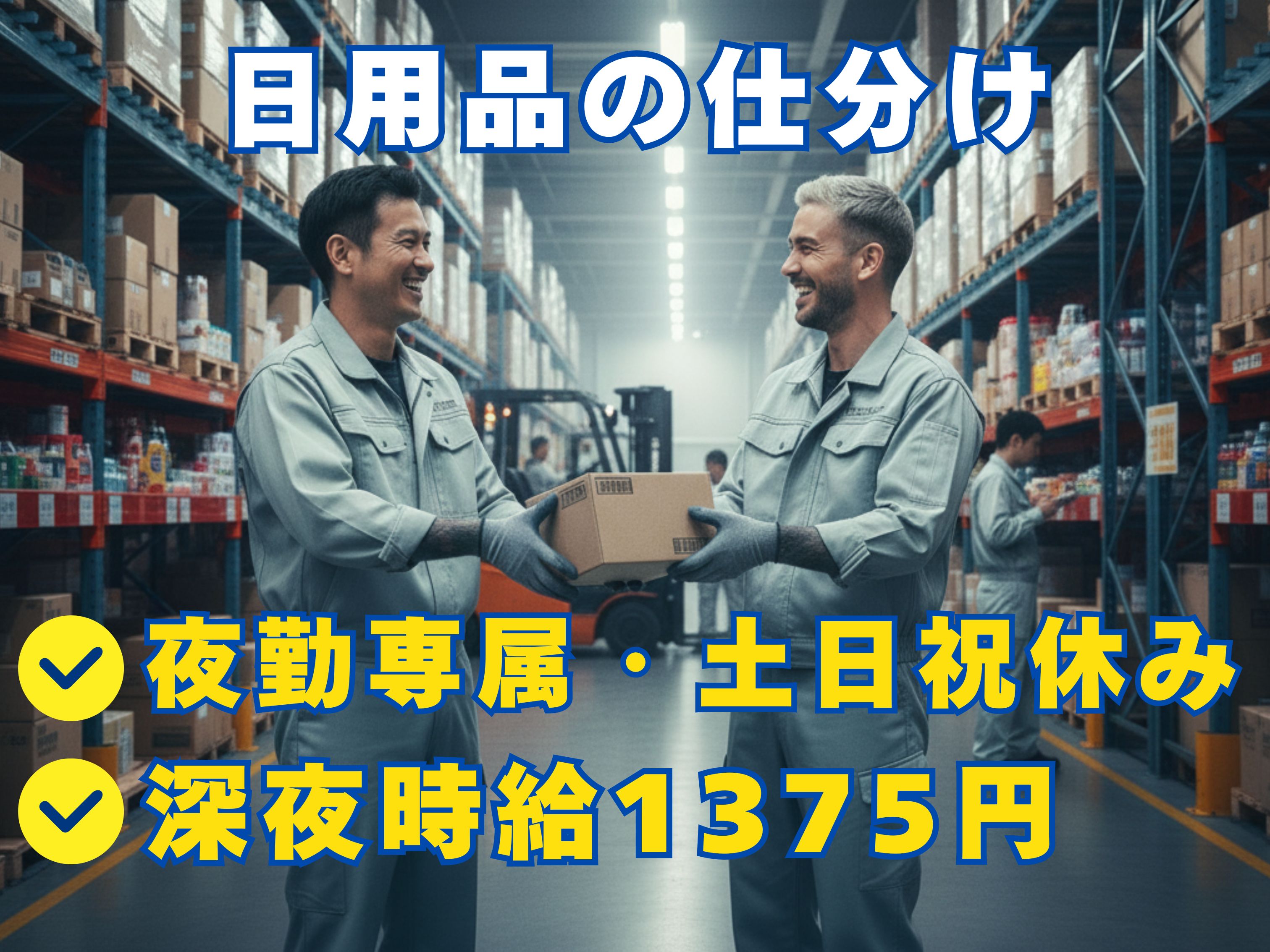【夜勤専属・土日祝休み】未経験OK★深夜時給1375円★/日用品の配送先ごとに仕分ける!