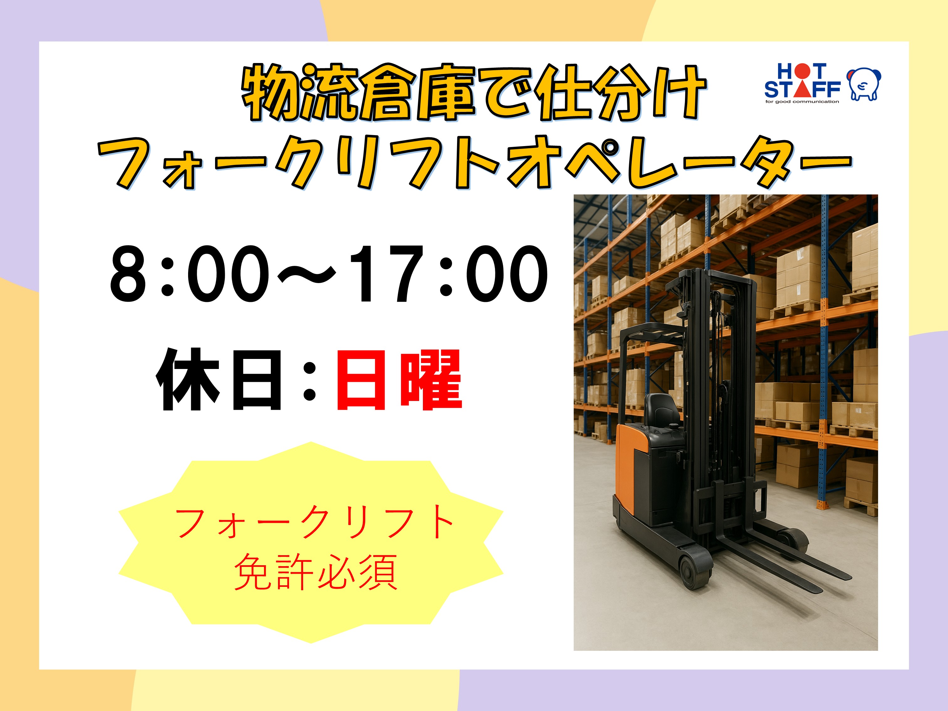 物流倉庫で仕分けや検品・フォークリフト業務・日曜固定のお休み・資格が活かせる