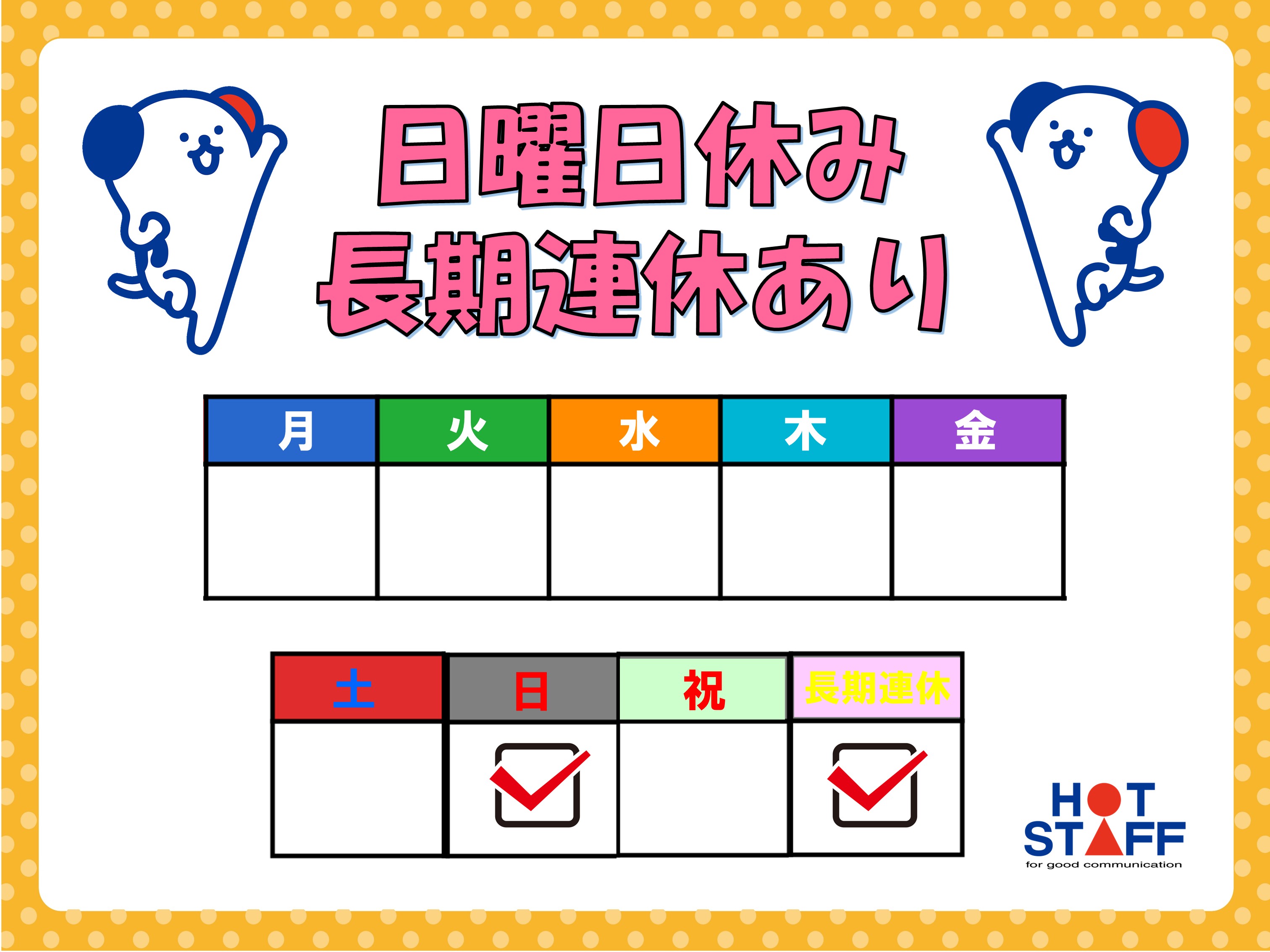 ※月1回、日曜日出勤もありますが、その際は代休または週6日勤務となります。