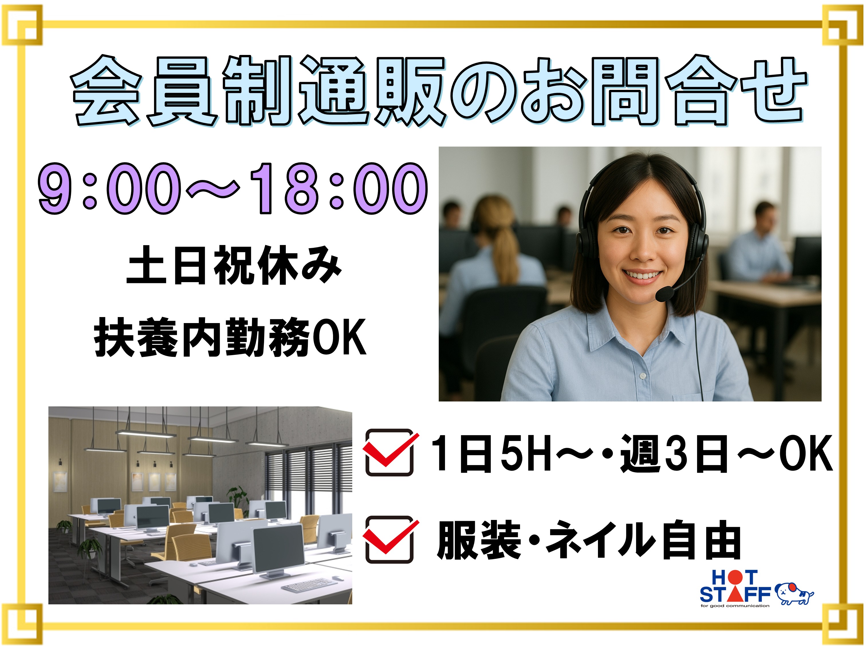 通販のお問合せオペレーター・服装やネイル自由・週3日勤務~・土日休みや扶養内勤務も相談可能